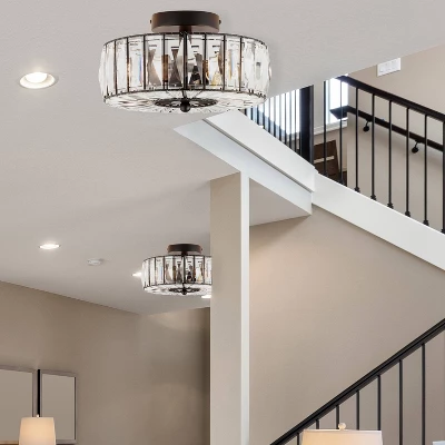 Upgrade your living room or dining room decor with the beautiful and versatile style of this Oil-Rubbed Bronze Metal and Crystal Hanging Lamp from River of Goods. Designed with a circular canopy made of metal in a dark oil-rubbed bronze finish, this semi-flush mount ceiling light also features faceted crystal panels around the outside and on the bottom for a stunning lighting look. This overhead light hardwires into your ceiling for a clean look, and makes a great choice to place above a dining table, in an entryway or in the center of your living room.