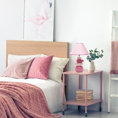Stones of ceramic in pink variations stack vertically to create a lovely sturdy base beneath the empire fabric shade in a light pink with darker pink trim. This table lamp is the perfect fit to add a little colored dΓ©cor to your space and even works in a nursery or child’s room!
