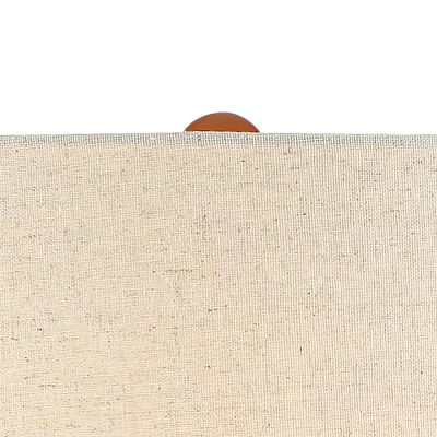 - Warm red oak finish wood neck and bottom. Off-white fabric cylinder shade. 7-foot long black cord and plug.