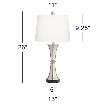 - Silver finish with black finish accents. Metal construction. White drum shades. 8-foot long clear cords with clear plugs.
