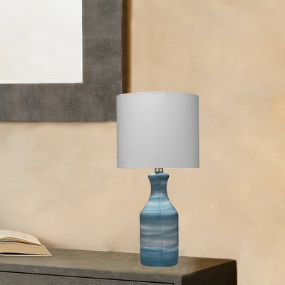 A serene choice for any room in your home. Handmade by artisans of ceramic, the base features swirls of color in a soft palette that vary from piece to piece, making this tabletop lamp your own one-of-a-kind piece of art. Topped with a crisp linen drum shade with a rolled edge for tailored definition. It’s a bright and airy accent for any nightstand, console or desk.