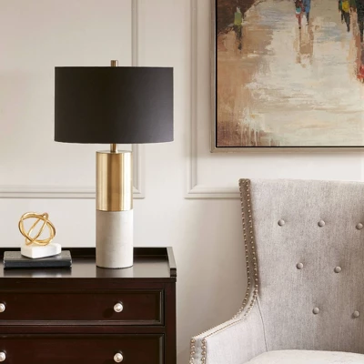 Define your space with the decadence of Hampton Hill’s Fulton Concrete Table Lamp. The steel and concrete base flaunts a gold metal finish that spirals around itself for a glitzy look. A fabric drum-shaped shade lavishly complements the base with its gold hue. The 72-inch clear cord provides plenty of length to place the lamp in your living room or bedroom for extra light, while a switch located on the socket allows you to easily turn the light on and off. Ornate in design, this metal table lamp gives your décor an eye-catching and luxurious touch. One Type A light bulb is needed(not included). Comes with a 2-year warranty.