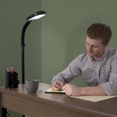 Brighten up your home with this Hastings Home Natural Daylight Floor Lamp. The replaceable bulb turns on easily through a switch near the lamp head and gives out a natural sunlike brightness to get your sewing, reading, hobbies, and crafts done with ease while reducing eye fatigue. This floor lamp features a bendable neck for flexible lighting, and the black design is a great addition to minimalist decor in offices, work areas, or bedrooms.
