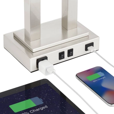 Possini Euro Design Amity Modern Table Lamp 26″ High Brushed Nickel With USB And AC Power Outlet In Base White Linen Shade For Bedroom Bedside Desk