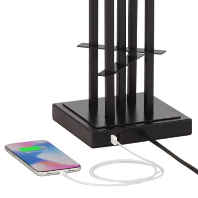 - Dual USB ports on the base for charging smart phones and other devices. Black finish grid base. Metal construction.